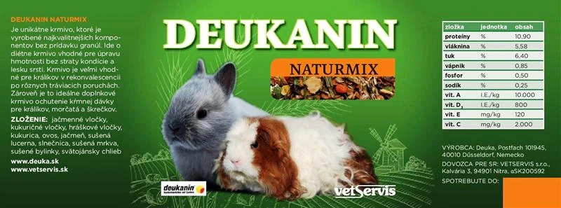 DEUKANIN NATURMIX: je novinka, ktorá bola vyrobená z najkvalitnejších komponentov bez prídavku granúl. Ide o diétne krmivo vhodné pre úpravu hmotnosti bez straty kondície a lesku srsti. Krmivo je veľmi vhodné pre králikov v rekonvalescencii po rôznych tráviacich poruchách. Zároveň je to ideálne doplnkové krmivo ochutenie kŕmnej dávky pre králikov, morčatá a škrečkov.