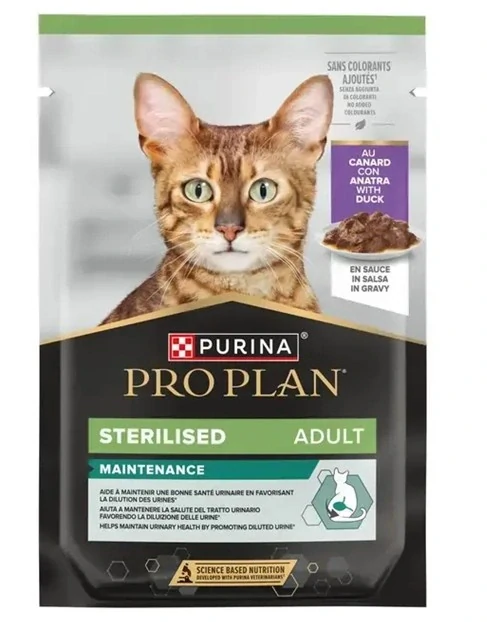Kompletné krmivo pre dospelé kastrované mačky Pro Plan Cat Sterilised Maintenance. Kapsička s kačkou v šťave podporí imunitu vášho domáceho maznáčika, štíhlu líniu a dlhodobú spokojnosť.